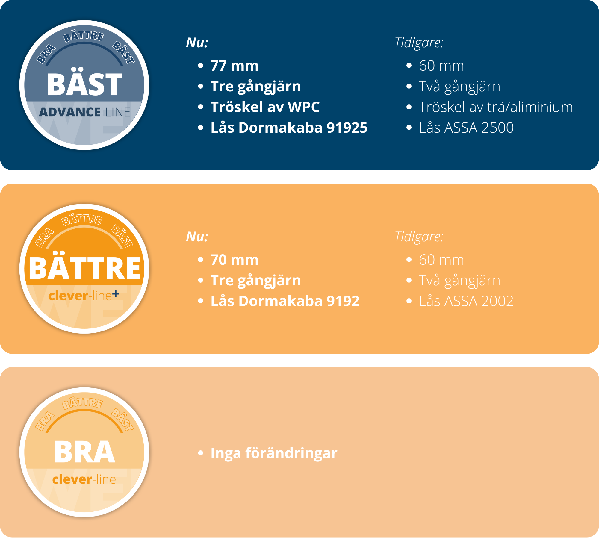 Den 1 april 2026 uppgraderas vårt ytterdörrssortiment och därför kan dörrarna som visas i våra kunders utställningar skilja sig från de dörrar som levereras. Här nedan specificerar vi förändringarna: